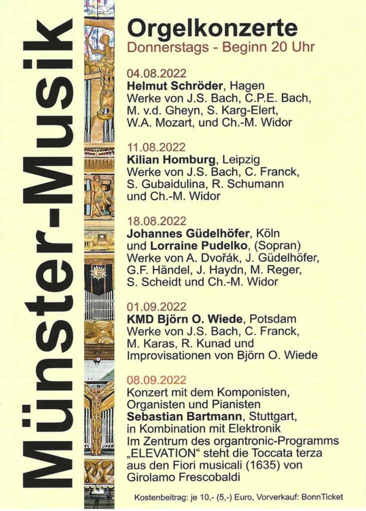 Deshalb hier der Hinweis auf fünf wunderbare und abwechslungsreiche Konzerte an der großen Klais-Orgel im Bonner Münster im August und September 2022: