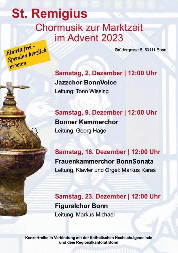 Markus Karas und die mitwirkenden Sängerinnen und Sänger sowie Musikerin-nen und Musiker und die die Bonner Münster-Musik unterstützenden Freunde und Förderer der Musik am Bonner Münster e.V. würden sich freuen, Sie auch im neuen Jahr wieder in großer Zahl in dieser wie auch den kommenden kirchenmusikalisch besonders gestalteten Festmessen und Festhochämtern begrüßen zu dürfen,